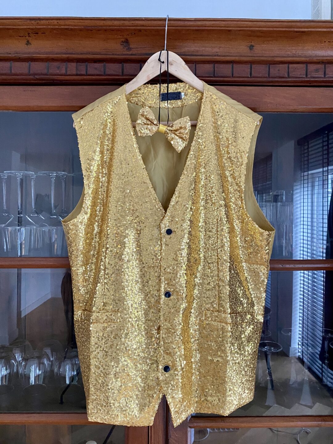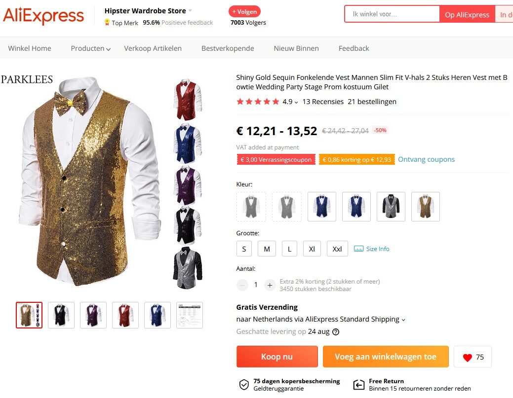 Jas (voorzijde) zoals die bij je thuis komt. Vacuüm verpakt. Even laten uithangen. - 1 Gilet- goud (met strikje). (klik hier) €16 (ongeveer). Kies je maat. De zakken zijn dichtgenaaid, maar kunnen desgewenst opengemaakt worden.