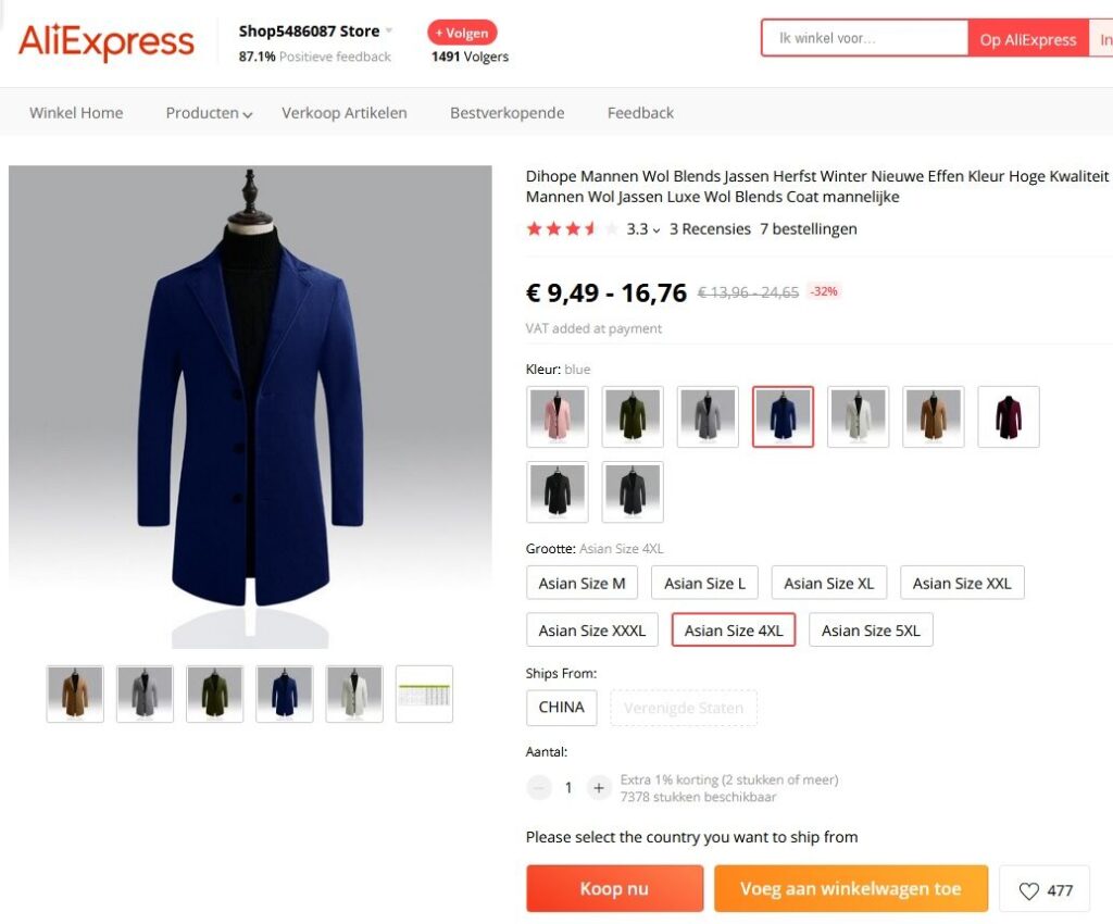 - 1 jas (klik hier). Ik heb gekozen voor de kleur ‘Navy blauw/blue’. Zoals een Ali bestelling betaamt is het altijd spannend wat ze versturen. Er zit tussen de verschillende maten enig kleurverschil. Zo zijn de 4XL meer blauw dan de 5XL die meer naar zwart neigen. LB – lekker belangrijk.