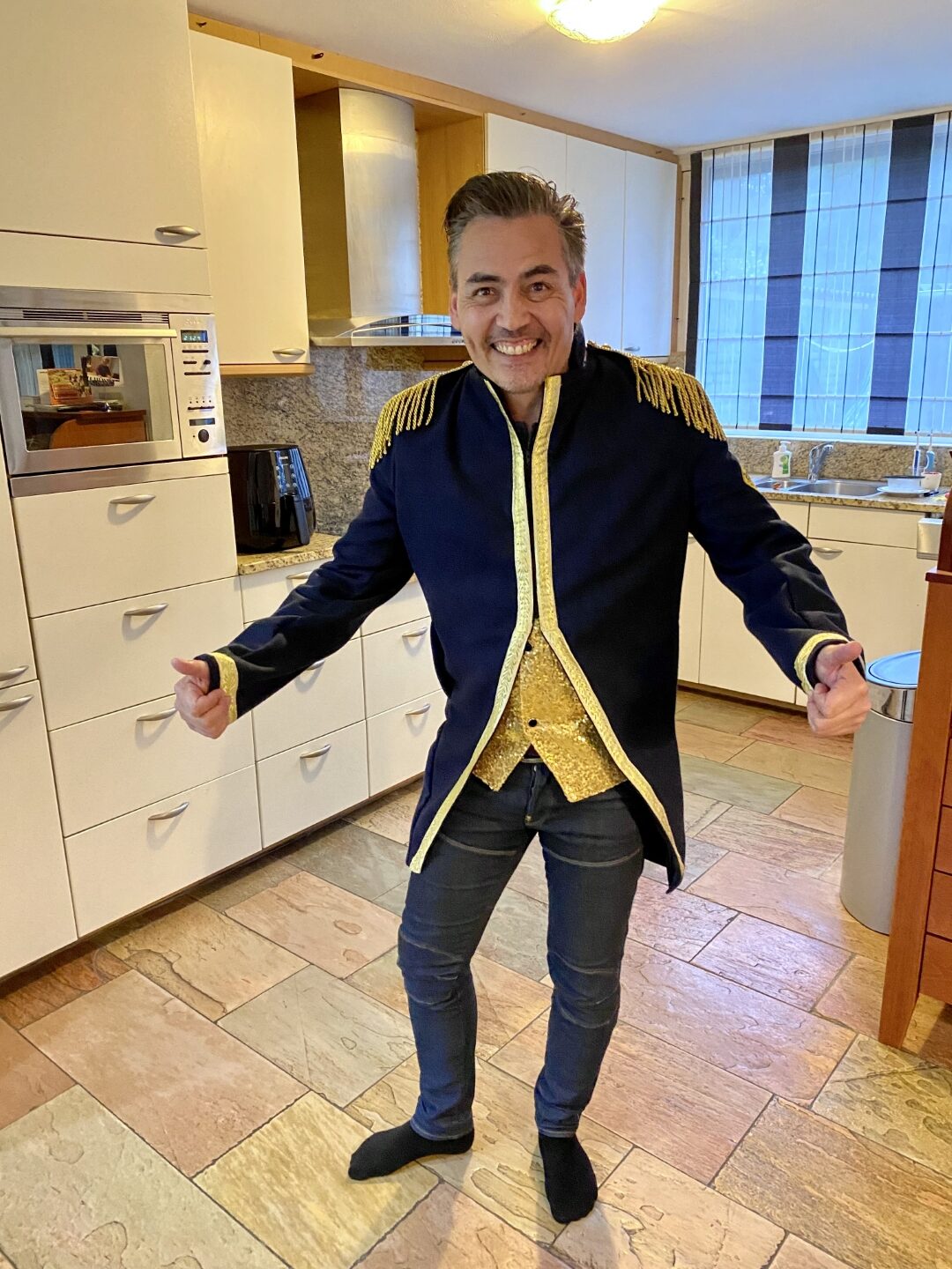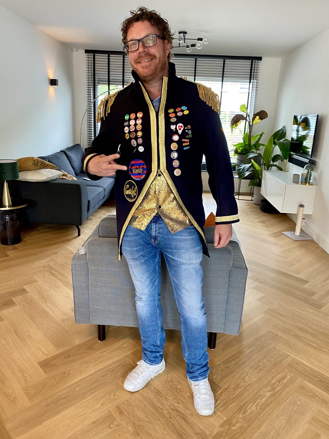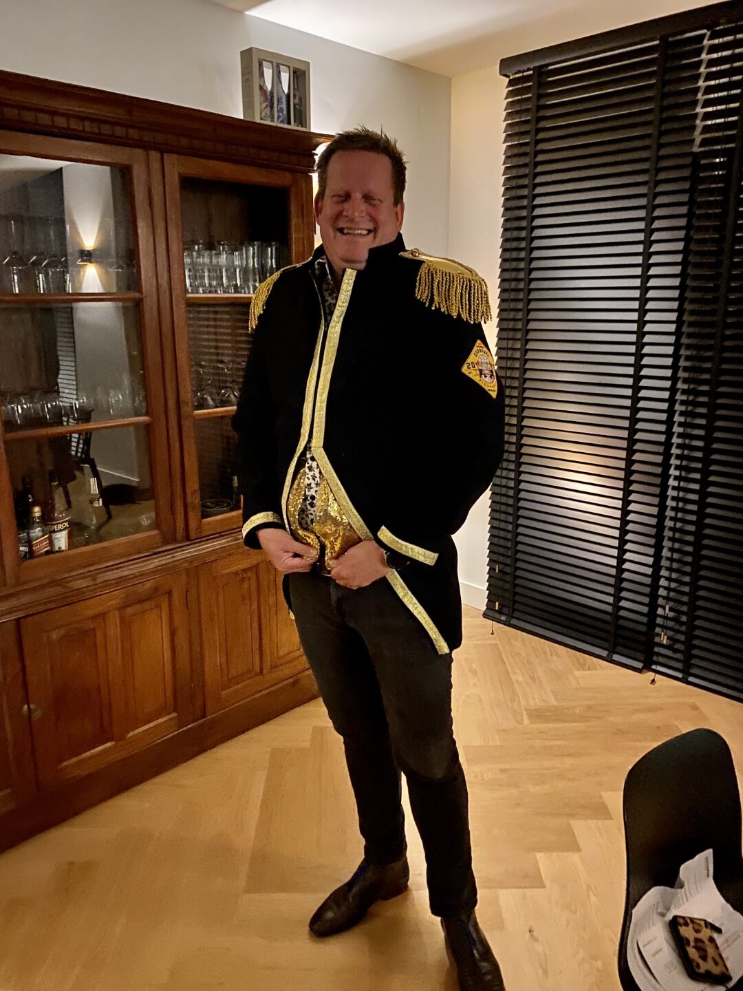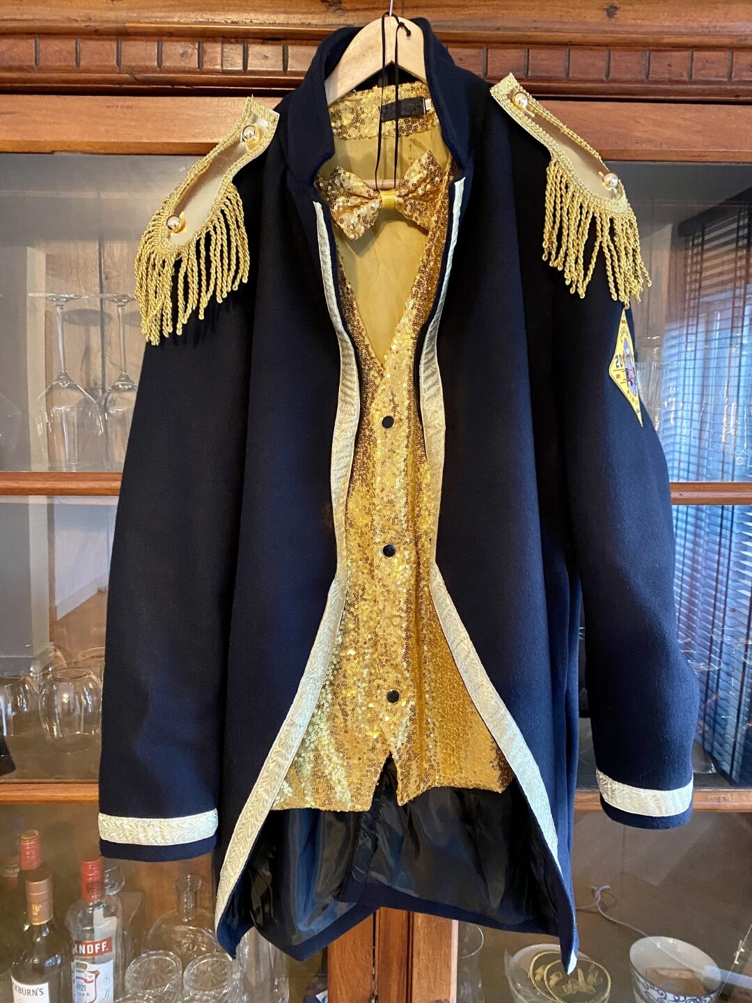 De laatste stap. Natuurlijk zal de jas in de toekomst worden aangepast met emblemen en spelden die tijdens de carnaval verzameld worden. Echter ik heb het jaarembleem bij de jassen die ik gemaakt heb altijd op de linkermouw ongeveer 2cm onder de klosjes van het epaulet gezet. De bovenhoek in lijn met de knopen. Om dat goed te kunnen doen heb ik de jas aangetrokken. Dit zorgt ervoor dat de binnen-jas met het lichaam mee gevormd wordt. Doe je dit niet, dan is er een kans dat de mouw gaat trekken, omdat de binnen-jas door het embleem aan de buiten-jas vast zit.