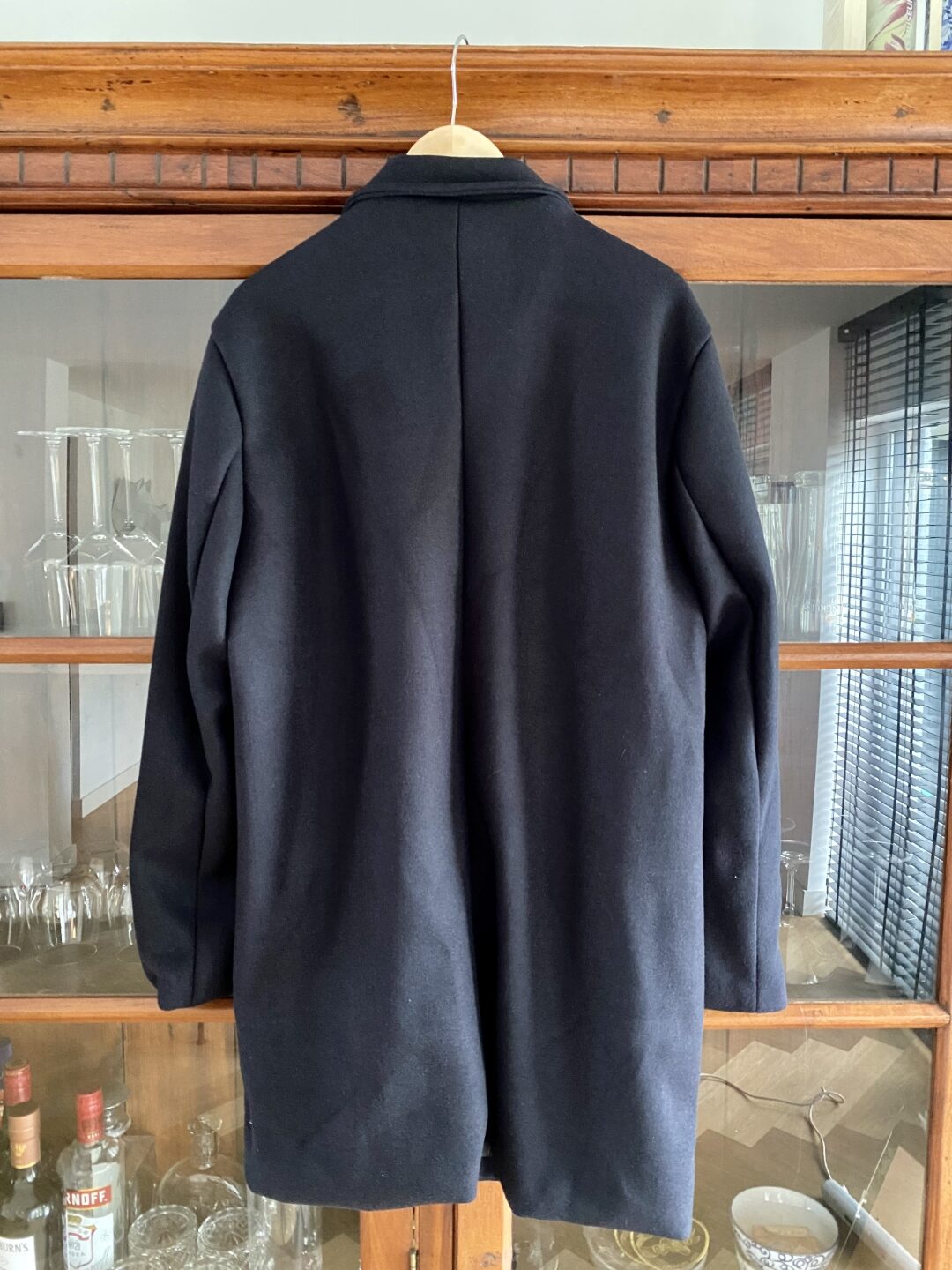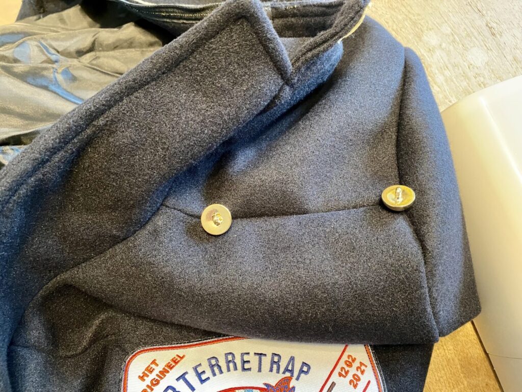 Zet de knopen vast op de schouders. 1 knoop op de kruising van naden bij de arm. De andere ongeveer 3cm van de hals als het een grote jas betreft. Bij kleinere jassen gaat de knop vaak tot bijna op de kruising van de naden van de schouders en de kraag.
