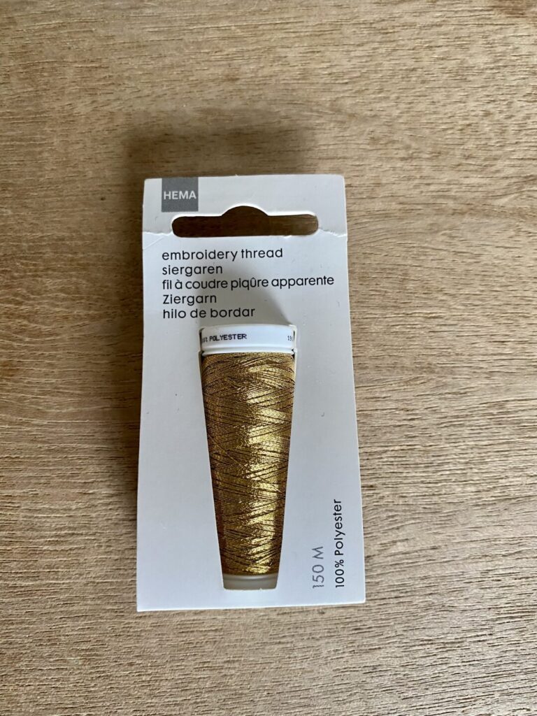 Stevig draad dat niet snel stuk gaat. Gebruikt voor de onderdraad en als er iets anders dan sierband moest worden vastgezet. - Hema goud €2,75/klos alleen voor sierband te bevestigen