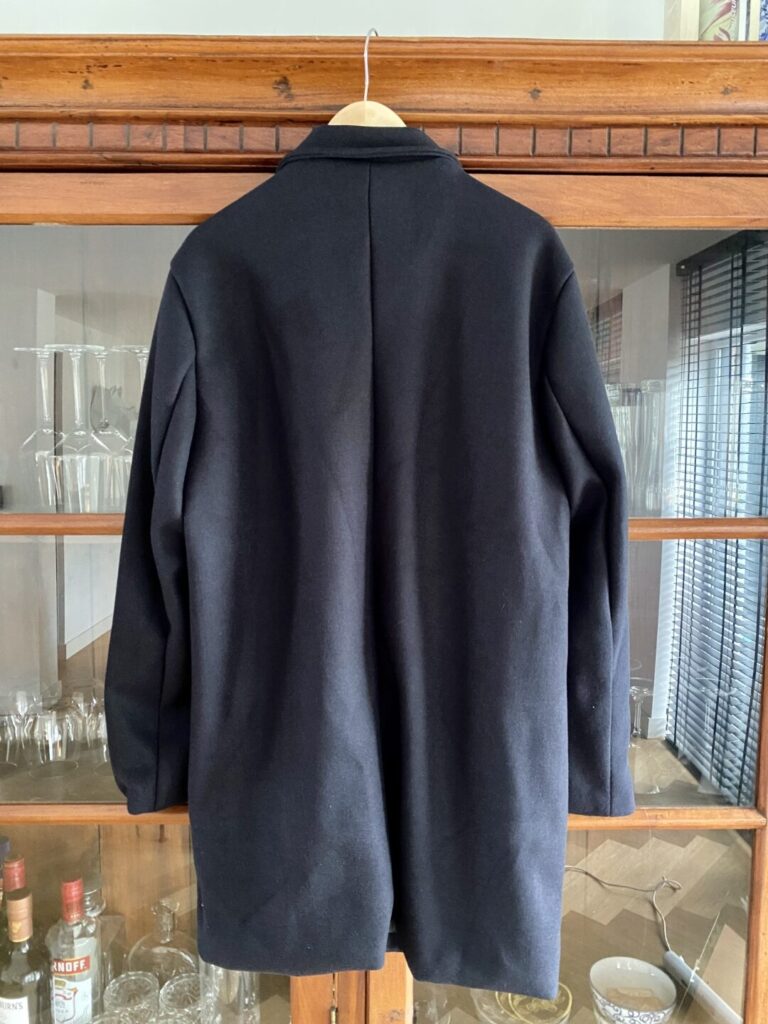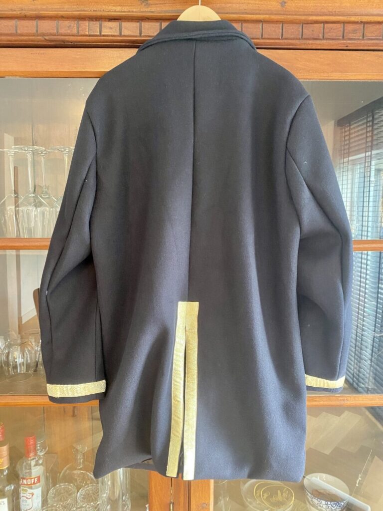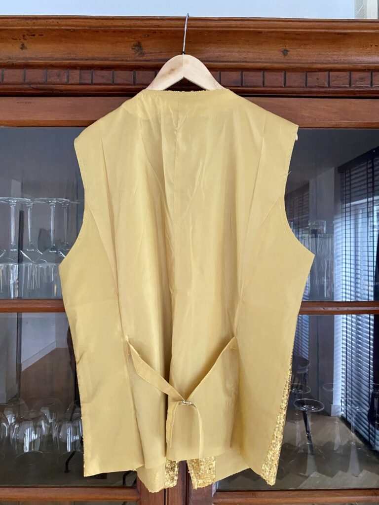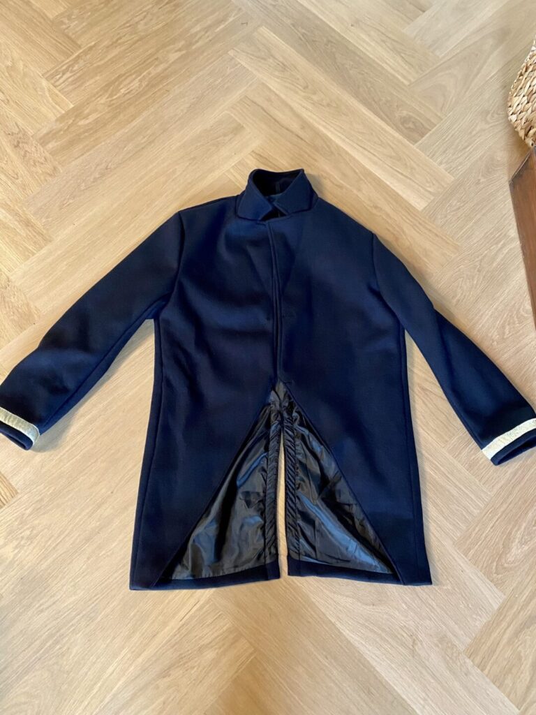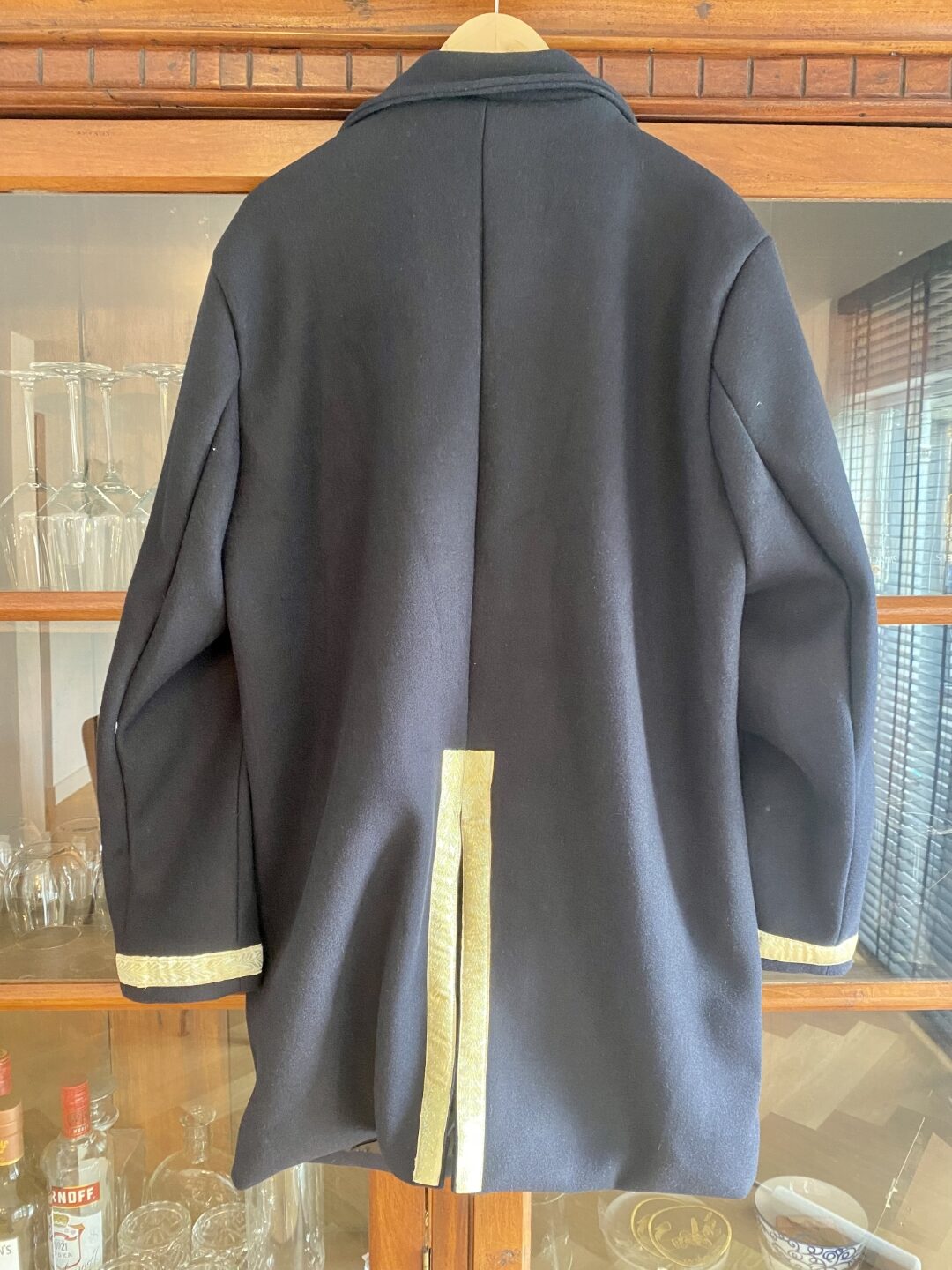 Achterzijde. Met handig ceintuur om hem wat strakker rond de buik te laten aansluiten. (Hoewel dit er voor de meeste onder ons voor de sier op zit, omdat hij van zichzelf al goed ‘aansluit’) - Sierband (klik hier). 25mm breed gouden sierband met motief van bladeren? Ongeveer 9 meter. Daarvan lukt het om een volledige jas en een volgende jas met alleen de mouwen en achterzijde te doen.