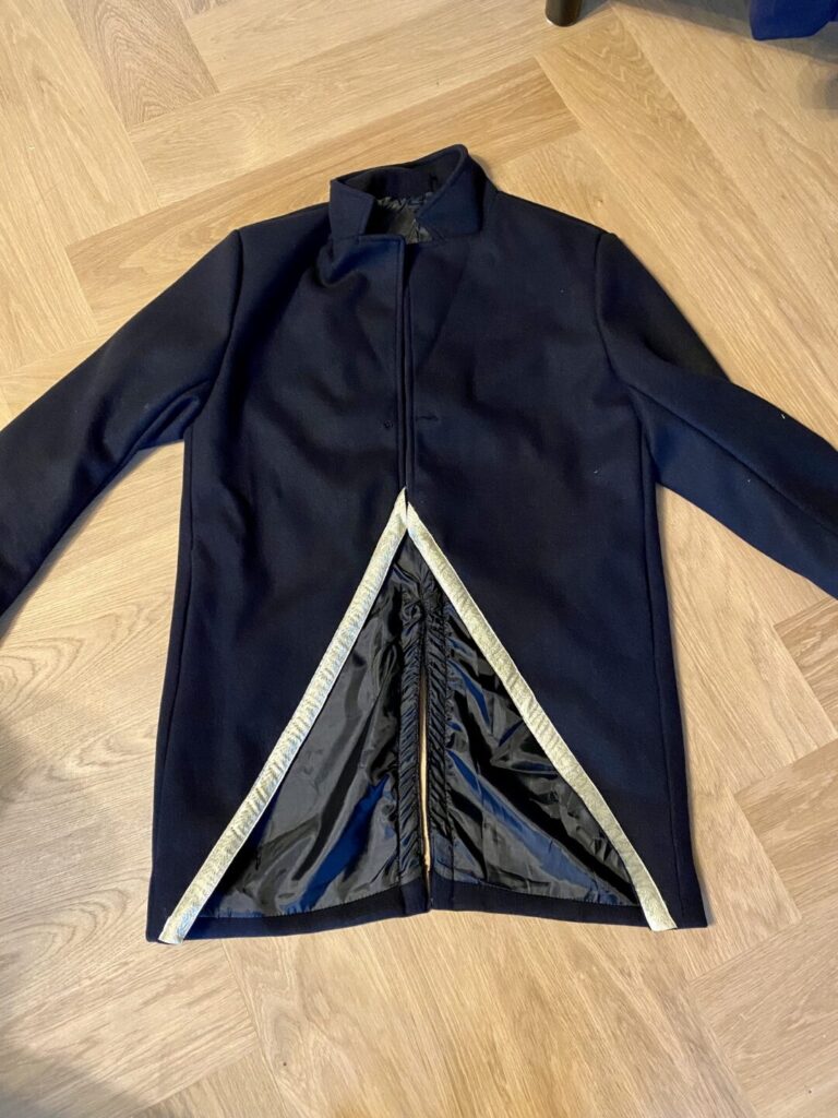 Plaats de sierband vanaf de speld tot aan de kraag met het motief naar beneden. Probeer de band gelijk/horizontaal te laten eindigen. Afhankelijk van hoe goed het gelukt is om de schuine delen bij elkaar te laten komen kan het effect verschillen. Hier zie je dat het linker deel iets lager is ‘gesmokkeld’ ten opzichte van het rechter deel, dat iets hoger staat. Echter van een afstand is het bijna niet te zien. En zeg nou zelf, het is een jas voor de carnaval.