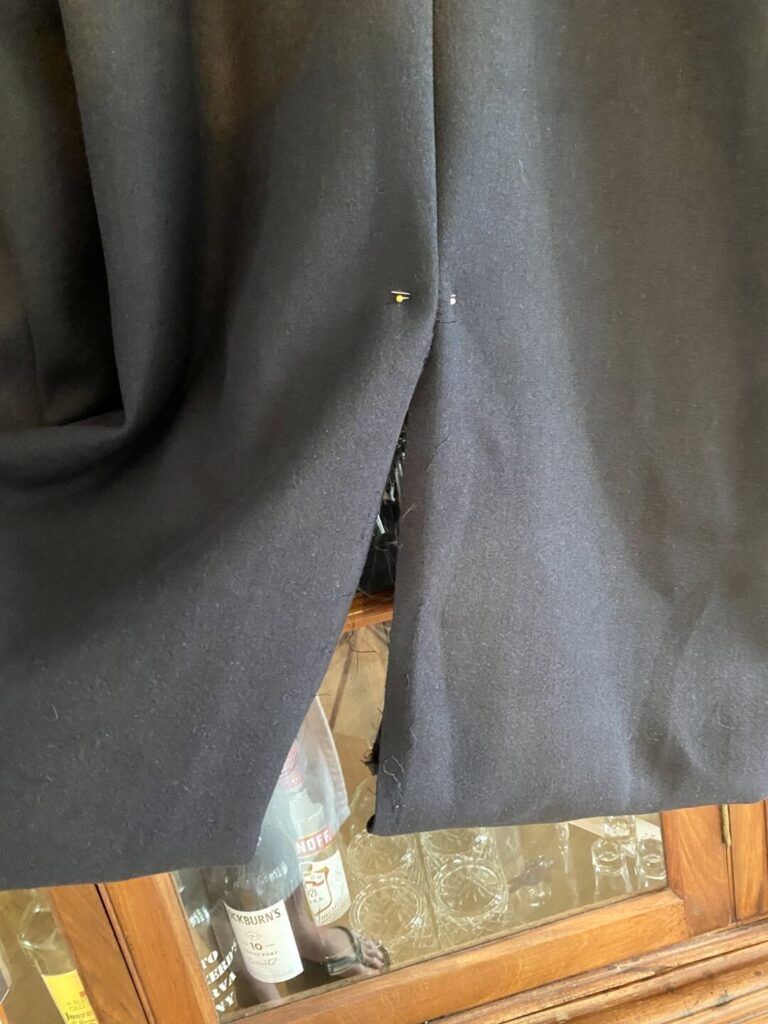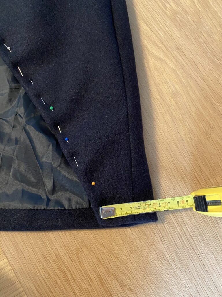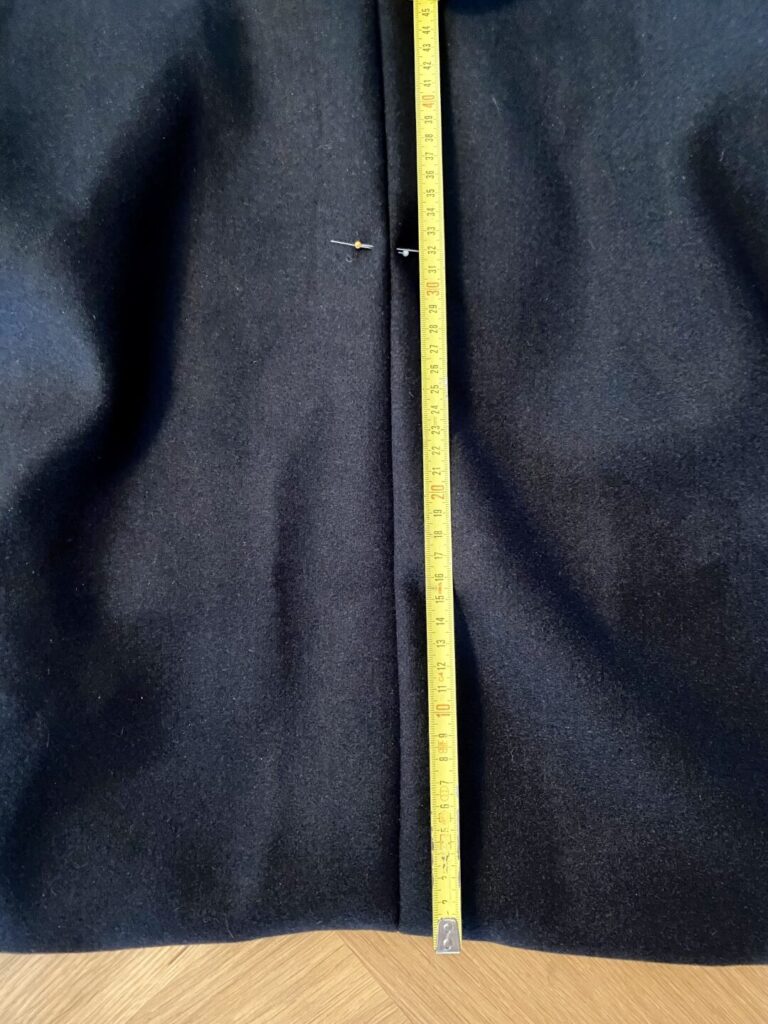 - Op de rugzijde worden spelden geplaatst op de naad in het midden van de jas op 32cm hoogte ten opzichte van de onderzijde. (Let op: de naad aan de binnenzijde loopt niet precies op de naad van de buitenzijde.)