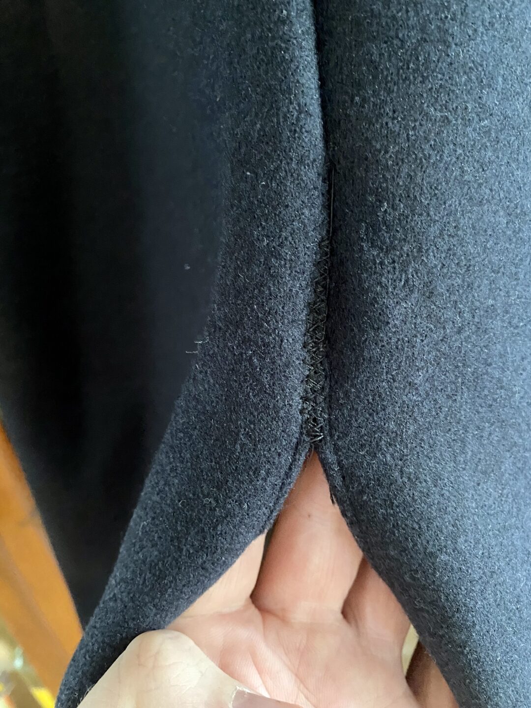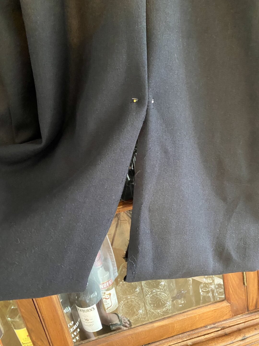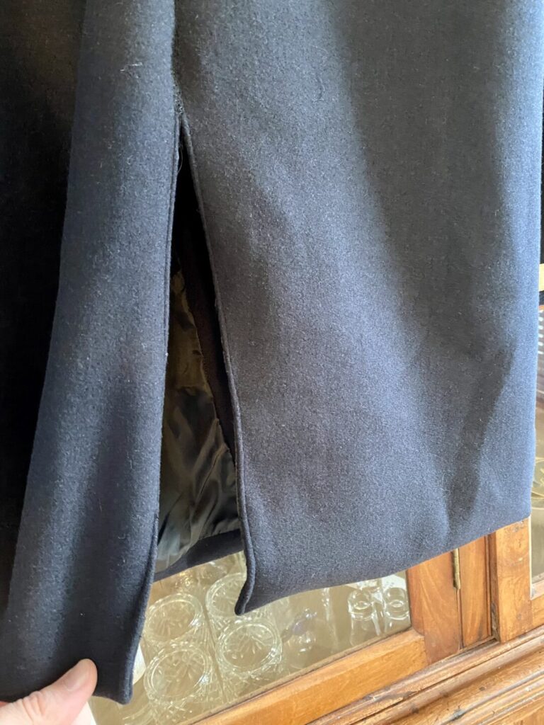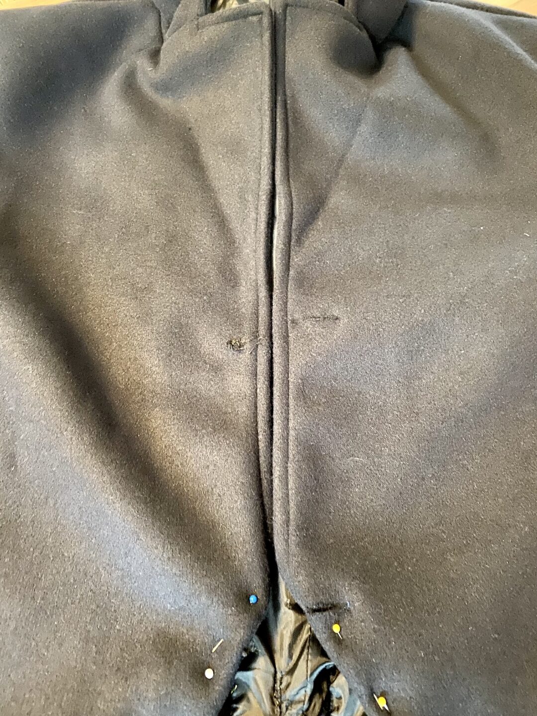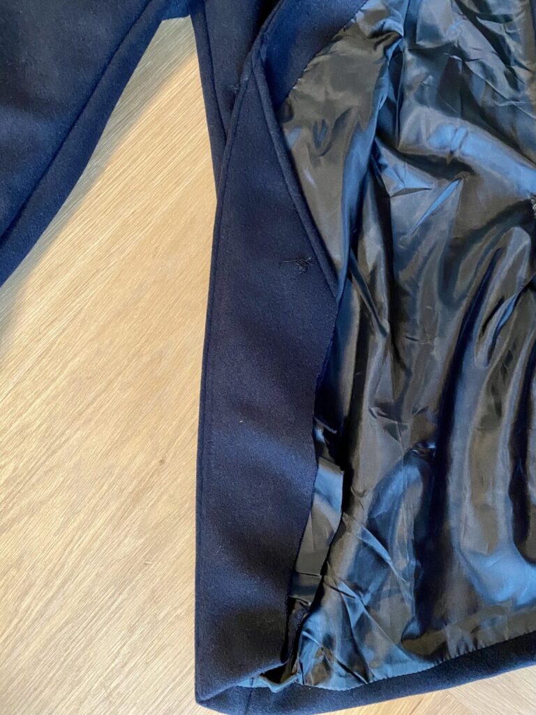 - Vervolgens wordt de naad van onderen opgewerkt tot aan de geplaatste spelden. Let op: trek daarbij niet de originele draden eruit. Deze dienen als referentiepunt om de jas straks te sluiten.