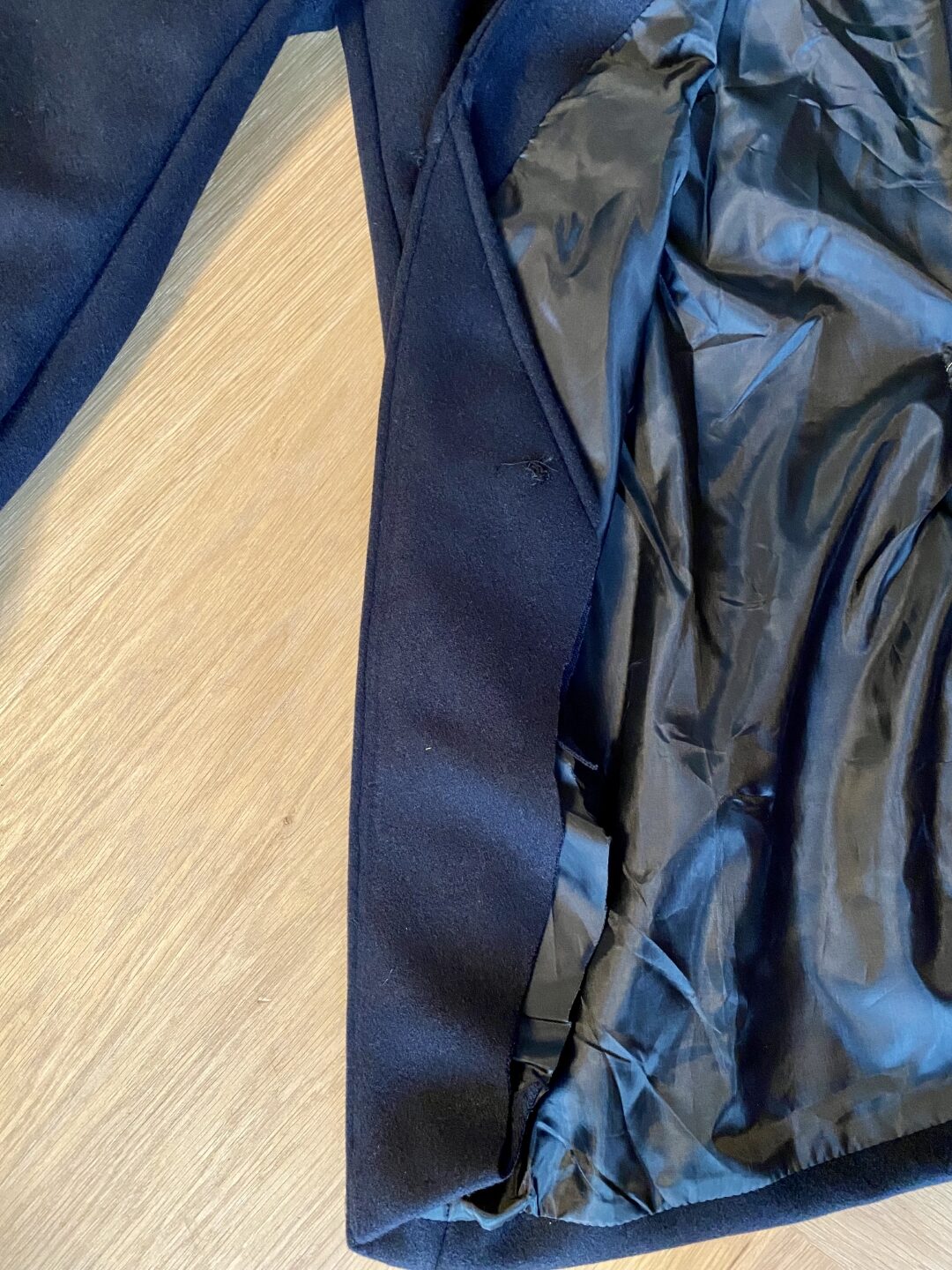 – Begin met de jas op een vlak oppervlak te leggen. Verwijder de knopen, maar laat het garen waarmee de knopen vastzaten nog even zitten. Tenminste de middelste knoop, omdat dit garen als referentiepunt dient.