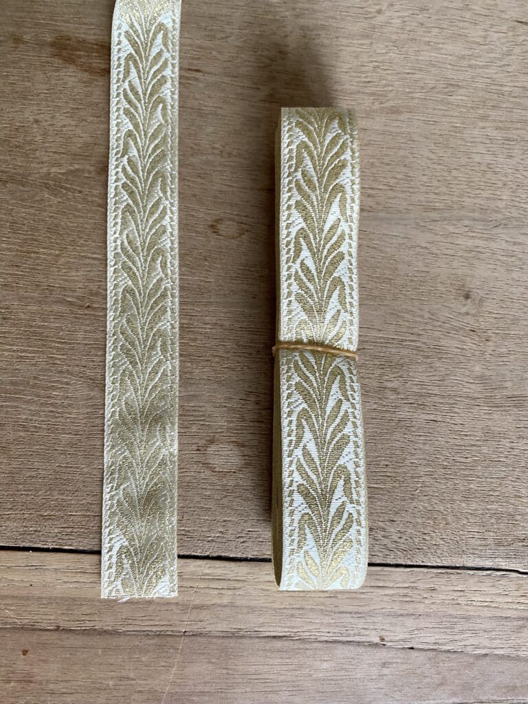 Sierband zoals die wordt bezorgd. De foto doet hem geen recht, want de gouden elementen geven een mooi reflecterend effect als er uit verschillende hoeken licht op valt. * Het patroon van de sierband heeft een richting. Voor het gebruik van deze tutorial zeg ik dat het bladeren patroon op de foto hierboven naar boven staat gericht (zoals een plant normaal gesproken naar boven, naar het licht, groeit). Het patroon van de sierband is op de mouwen naar buiten gericht en op de voorzijde en achterzijde naar beneden gericht.*