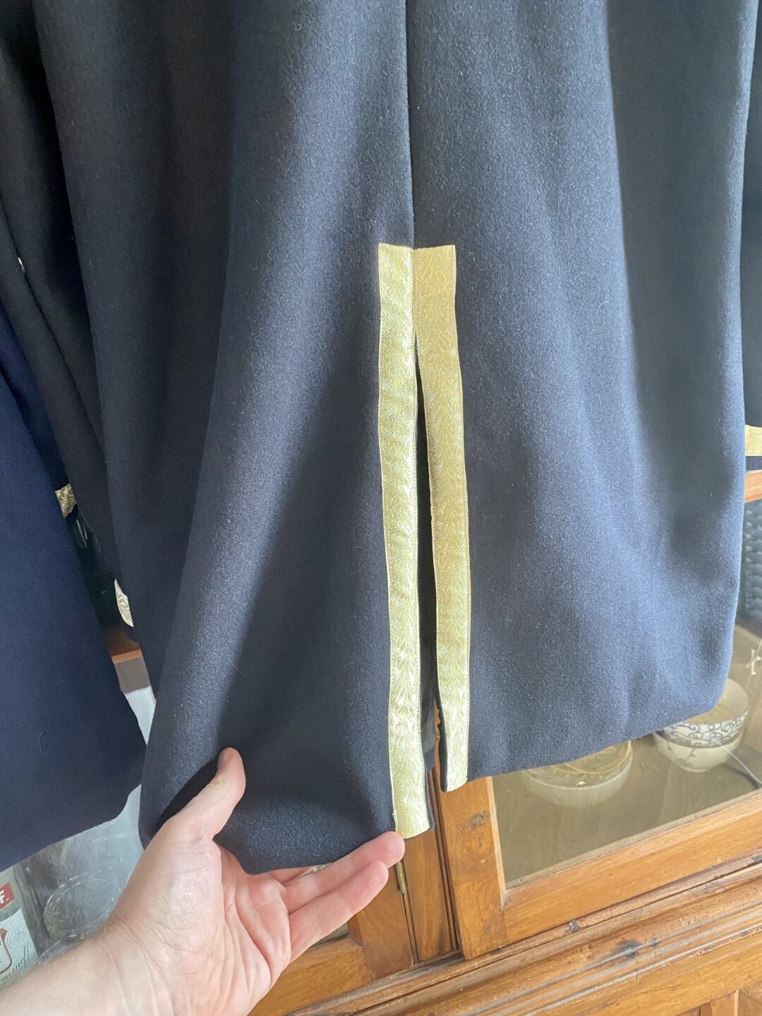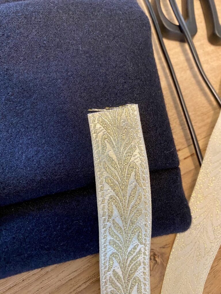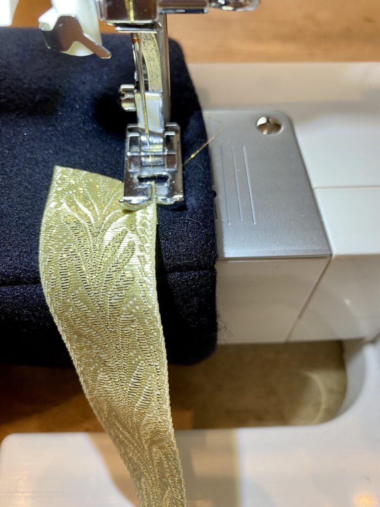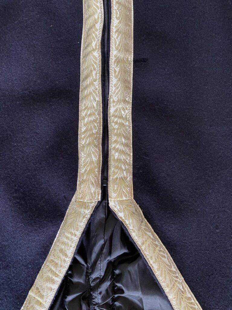 - Daarna is de sierband geplaatst met gouden draad en het patroon naar beneden. De sierband heeft een uitloop van 6cm boven de splitsing in de jas. Ook hier wordt geadviseerd om het uiteinde om te slaan voor het vastzetten. Het kan wel eens zijn dat je niet mooi horizontaal uitkomt waarbij er nog extra band is om dit te corrigeren.