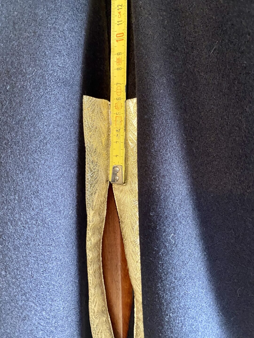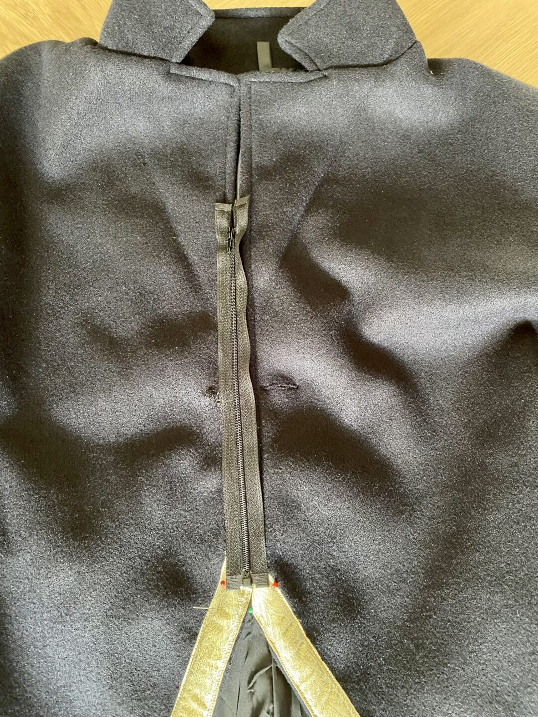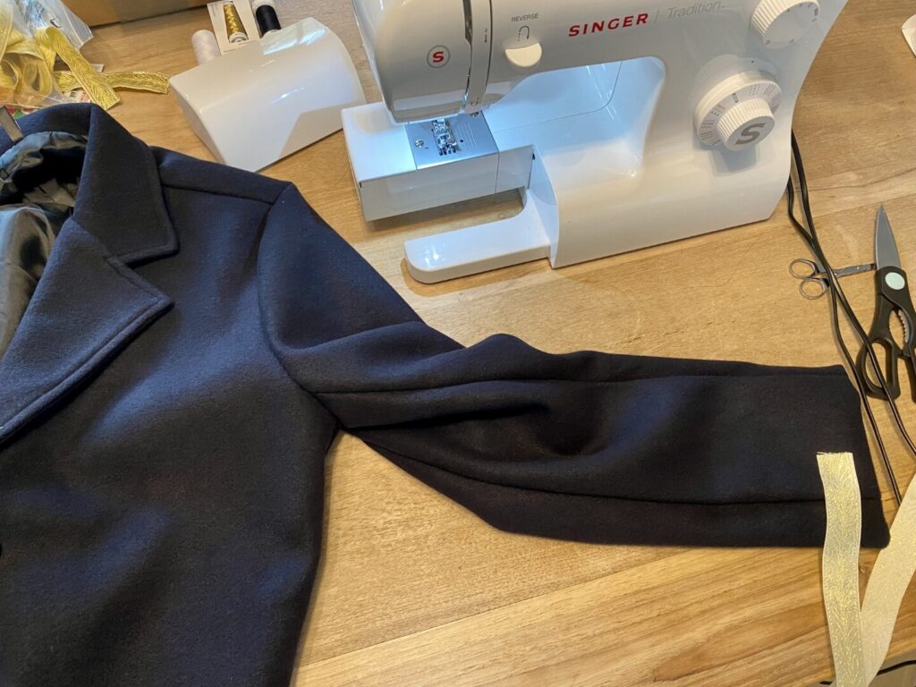 - Daarna is de sierband geplaatst met gouden draad en het patroon naar beneden. De sierband heeft een uitloop van 6cm boven de splitsing in de jas. Ook hier wordt geadviseerd om het uiteinde om te slaan voor het vastzetten. Het kan wel eens zijn dat je niet mooi horizontaal uitkomt waarbij er nog extra band is om dit te corrigeren.