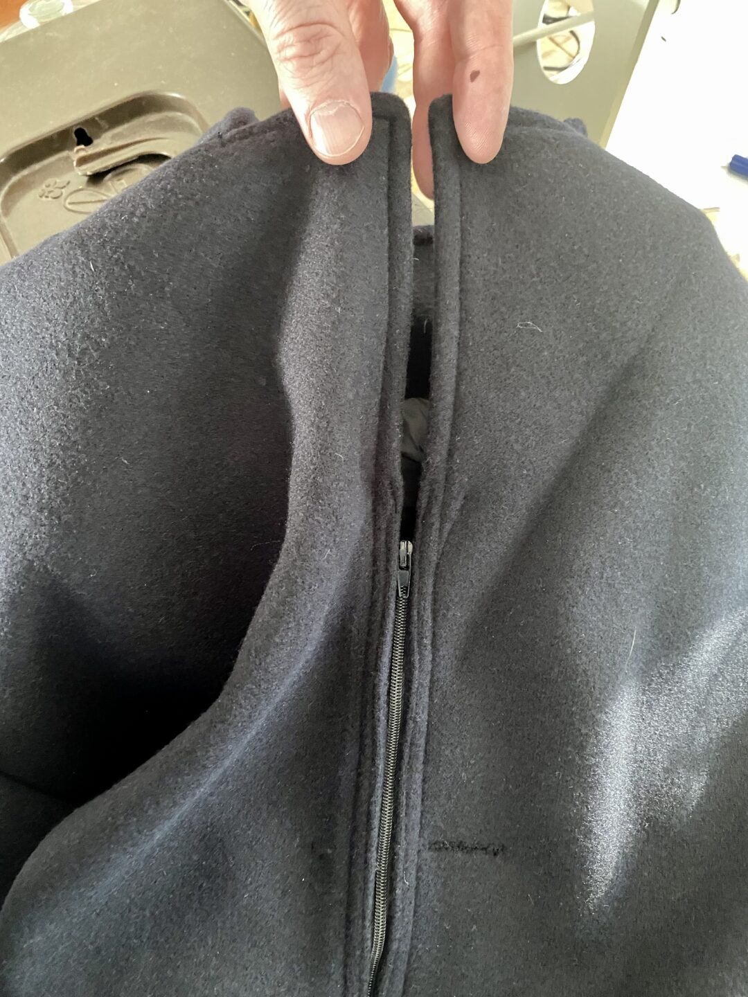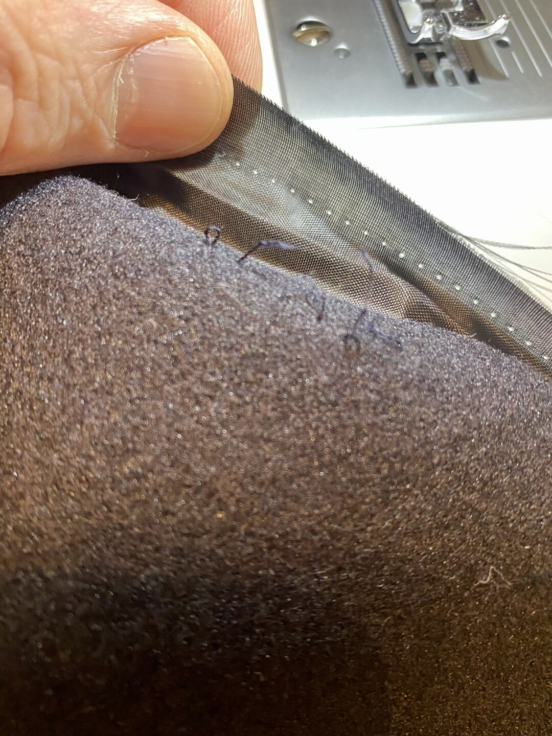 Binnen en buiten-jas heb ik op de stiklijn naar binnen gevouwen en op elkaar vastgenaaid. De stiklijn van de binnen-jas herken je aan de gaatjes en die van de buiten-jas aan de restanten van de draad die achter is gebleven. (zie foto onder) - Na het dichtstikken van de binnen-jas aan de buiten-jas is het overgangspunt verstevigd met een zig-zag steek, zodat deze niet verder kan inscheuren.