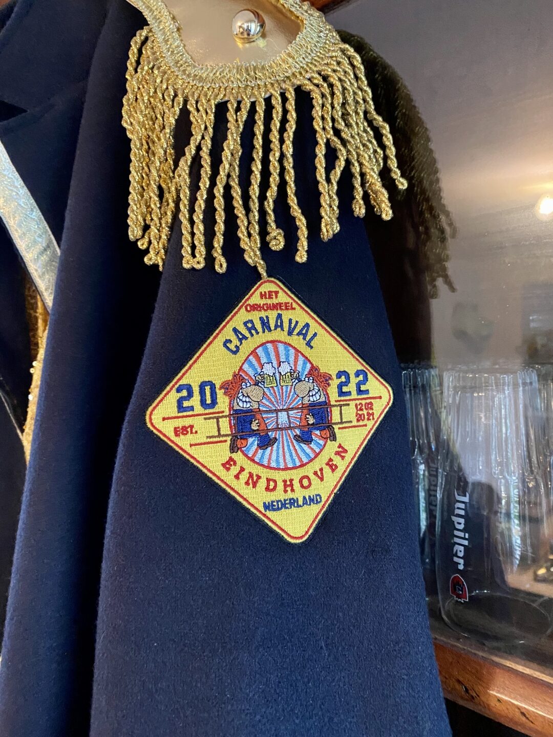 En nu begint het echt op een carnavals-jas te lijken. Nu alleen nog het jaarembleem. Dat kan nu beter worden ingeschat doordat deze op de linkermouw onder de klosjes van de epauletten moet vallen.