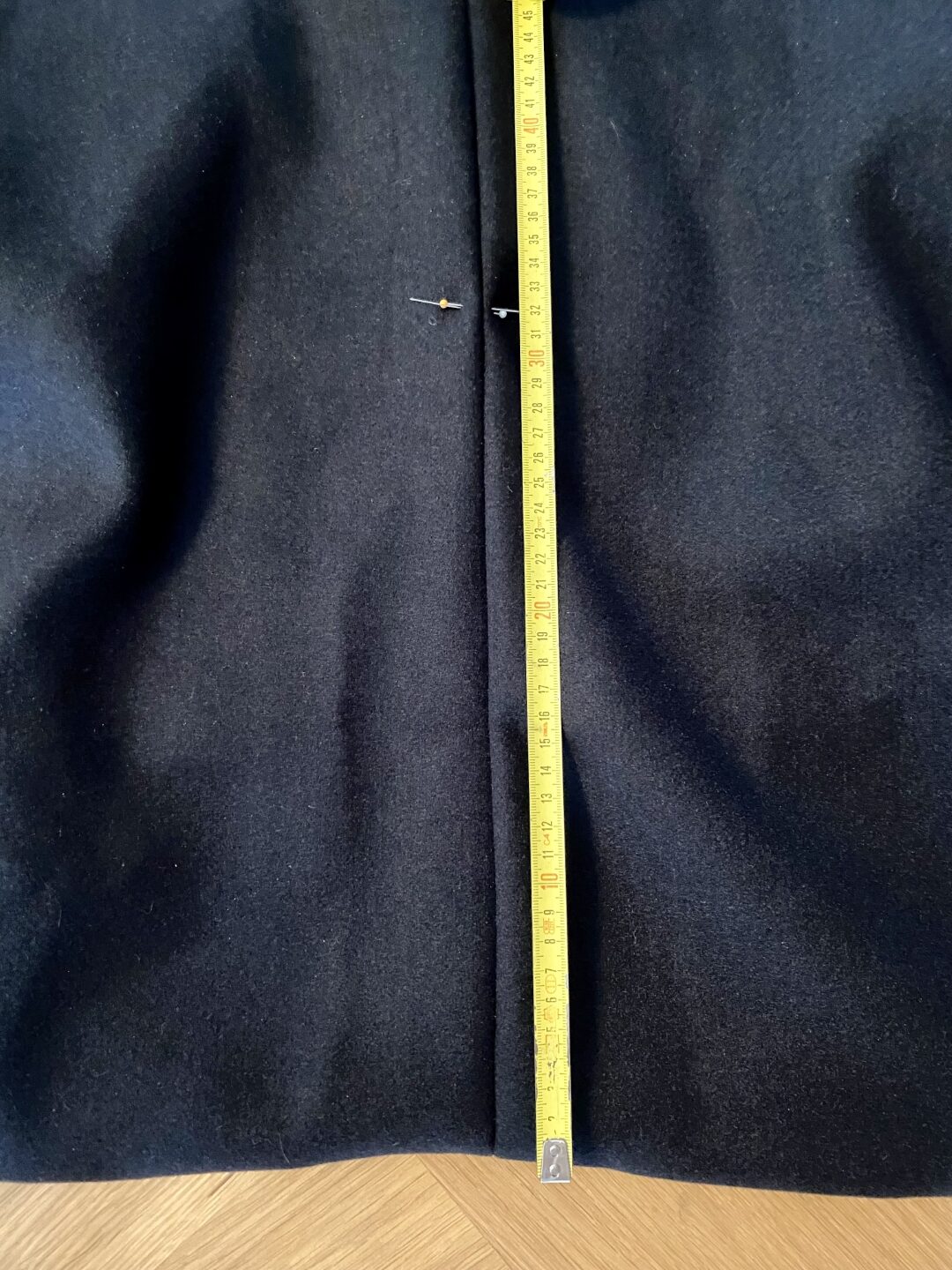 Op 32cm 2 naalden geplaatst om te markeren tot hoever de jas moet worden opgewerkt en om te voorkomen dat je jas verder openscheurt.